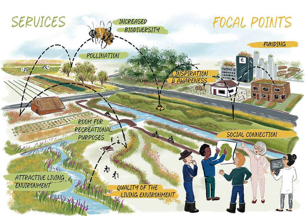 Many people take initiatives to help these insects but local measures are not enough. Improving the conditions for pollinators requires comprehensive and cohesive measures over a larger area to ultimately create a landscape where they can thrive: a ‘Bee Landscape’.